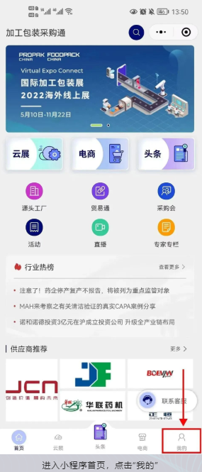 前往“加工包装采购通”小程序,进入“个人中心-我的名片”页面,完善个人信息,完成后截屏发送给客服企微,即可抽取1-50元话费、数据线、手机支架、100元京东卡等精美礼品,(活动步骤见下图)快来注册成为采购通会员,一键连接你和你的加工包装世界吧!