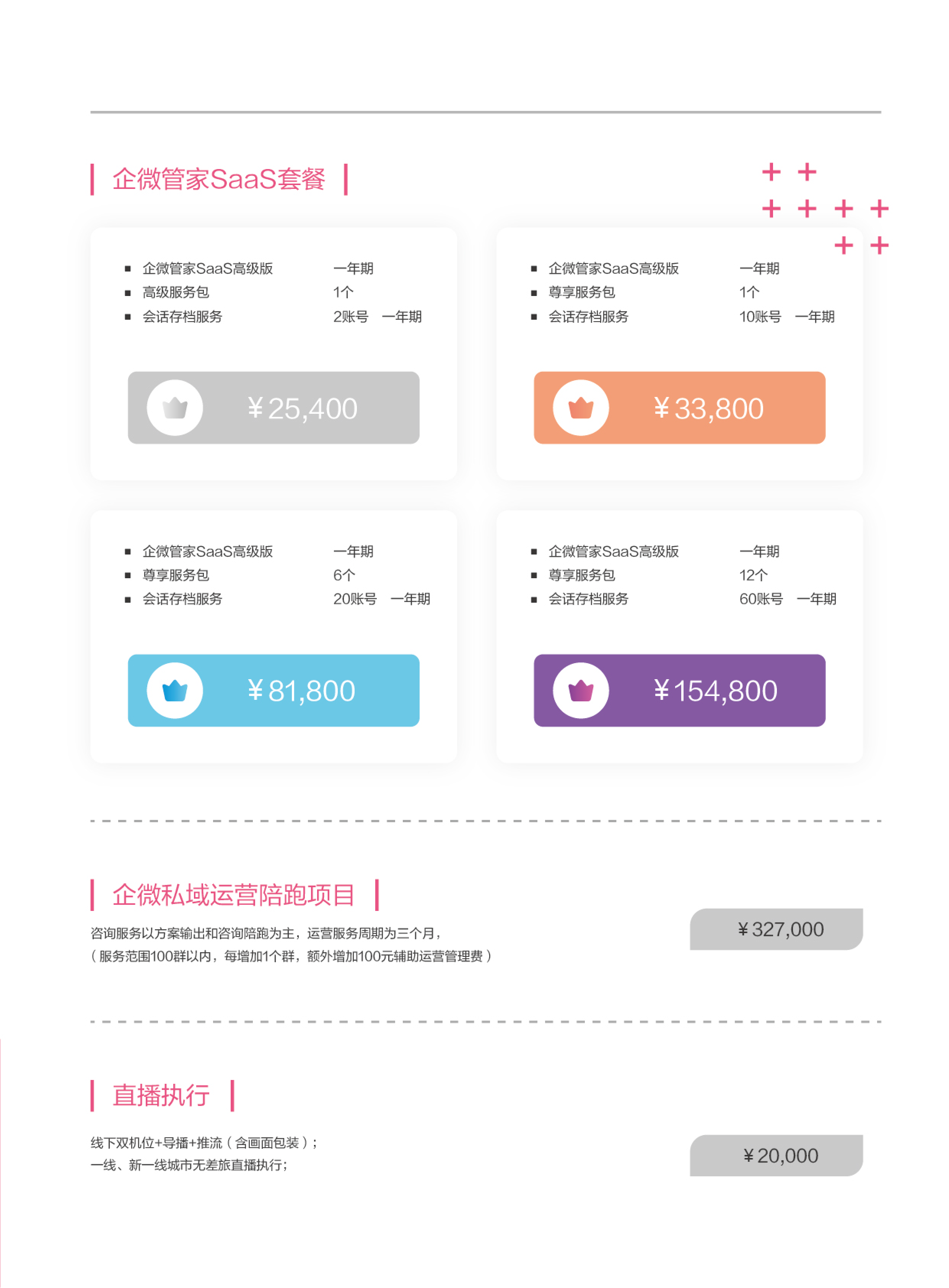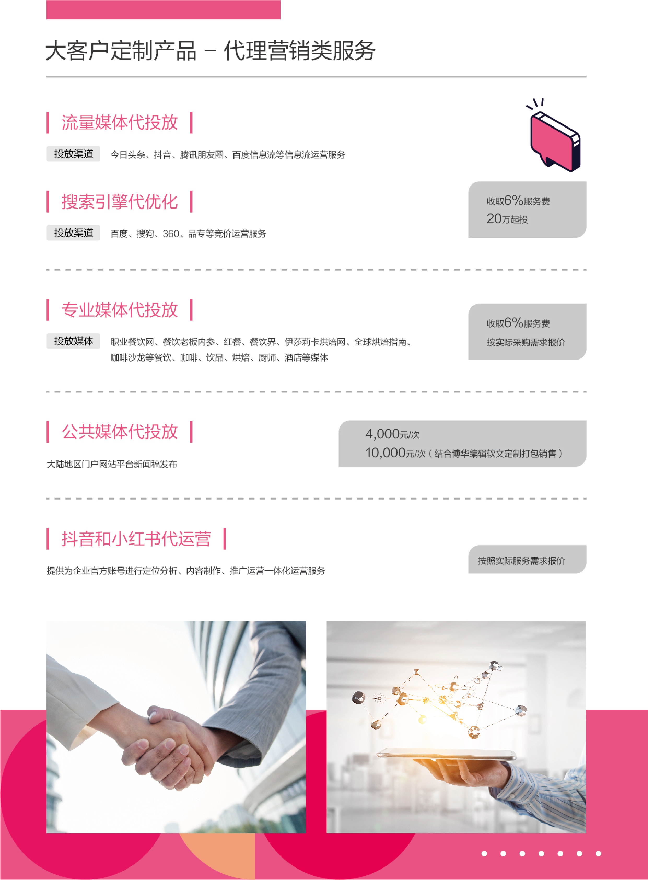 通过自身优质的数字化投放及运营能力,运用数字化工具为客户提供包括流量媒体投放,搜索引擎优化,企微管家SaaS,企微私域运营陪跑项目,直播执行等服务。